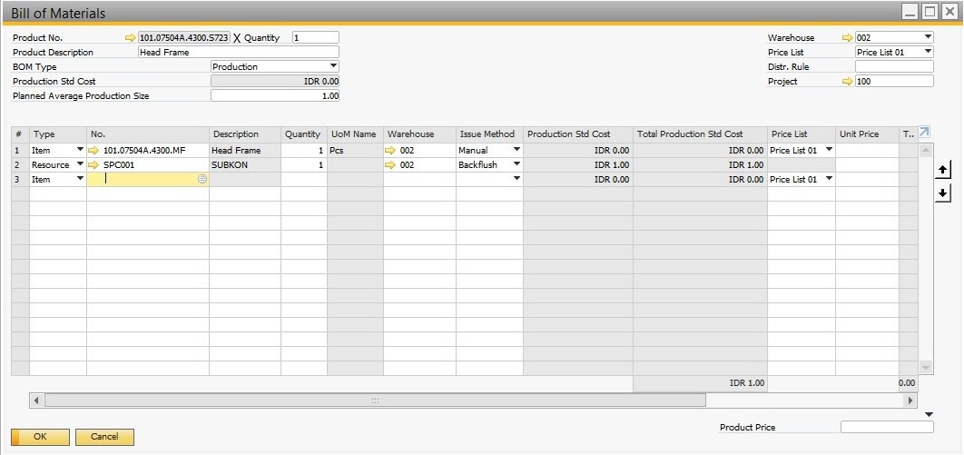 Berisikan daftar Item dan kemungkinan Resources yang dikonsumsi dalam proses Production Order.