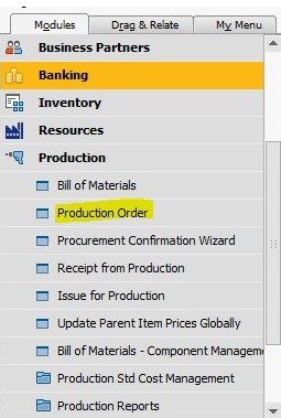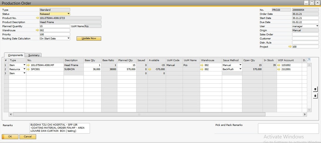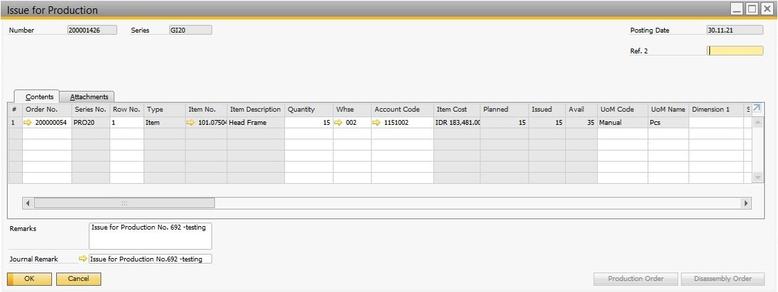 i. Pada modul Production Order yang menggunakan Issue Method Manual adalah Item, maka pada saat Issue Component type yang dipilih adalah Item: