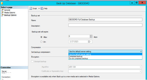 Jika semuanya sudah, klik pada Backup Options lalu pilih 'Set backup compression' yang akan digunakan, Jika ingin ukuran database di compress pilih 'Compress Backup' Jika tidak pilih User 'the default setting'