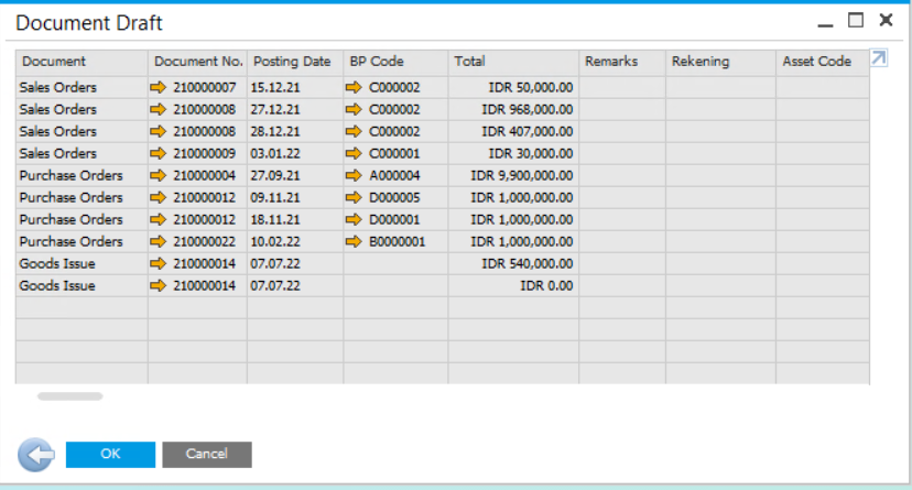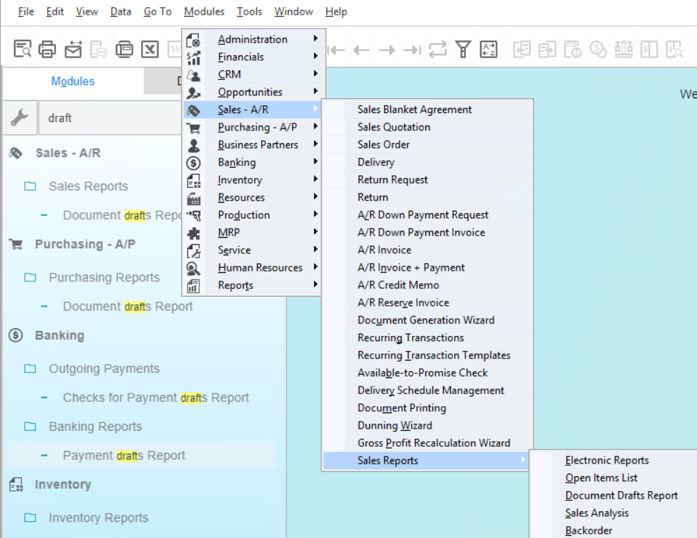 1. Pilih menu Modules > Sales - A/R > Sales Reports > Document Drafts Report atau Modules > Purchasing - A/P > Purchasing Reports > Document Drafts Report atau dengan ketik draft di Look Up Menus