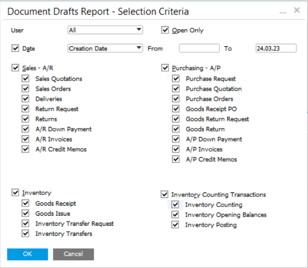 2. Kemudian akan muncul jendela Document Draft Report - Selection Criteria. Pada field User, pilih user tertentu atau All untuk semua user. Checkbox Open Only dimaksudkan untuk menampilkan draft yang belum dibuat dokumennya. Checkbox Date untuk mengaplikasikan filter tanggal sesuai dengan yang dipilih di dropdown list di sampingnya dan harus diisi di salah satu from/to atau dikeduanya jika dicentang.