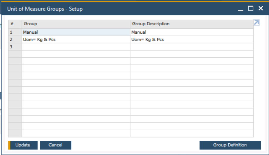 Kemudian untuk menambahkan UOM dan pengaturan quantity nya bisa dengan cara double klik di bagian nomor pada UOM Group yg akan di lakukan pengaturan.