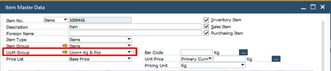 Ketika membuat Item Master Data pada kolom UoM Group dapat di pilih UoM Group yg sudah di setting pada module Administration tadi