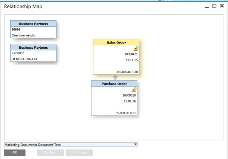 Relasi menunjukkan 1 Sales Order terhubung ke 1 Purchase Order