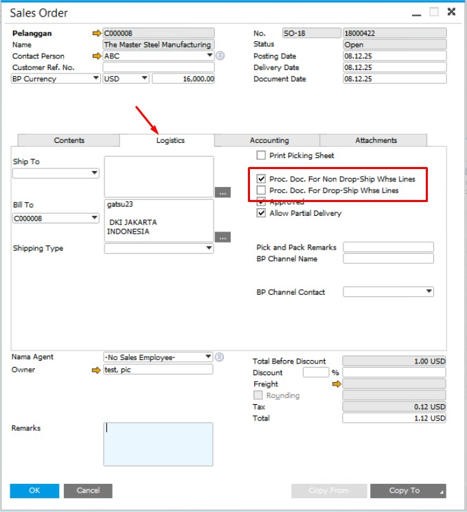 ☐ Proc. Doc. For Drop-Ship Whse Lines (tidak dicentang)