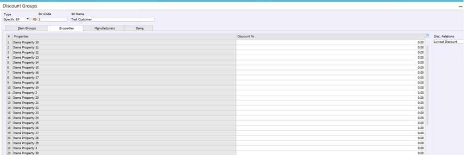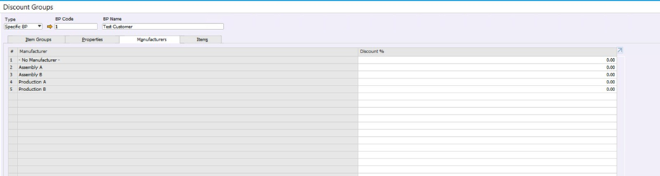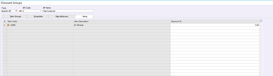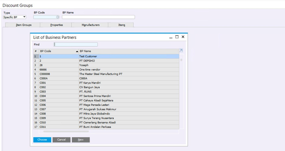 Discount Group di SAP Business One digunakan untuk mengatur diskon khusus yang diberikan kepada Business Partner tertentu (Specific BP) berdasarkan: