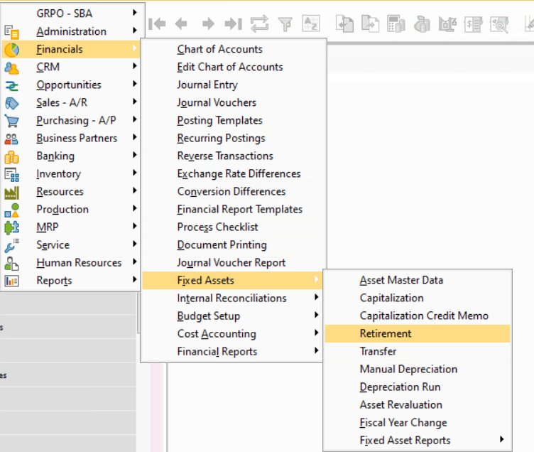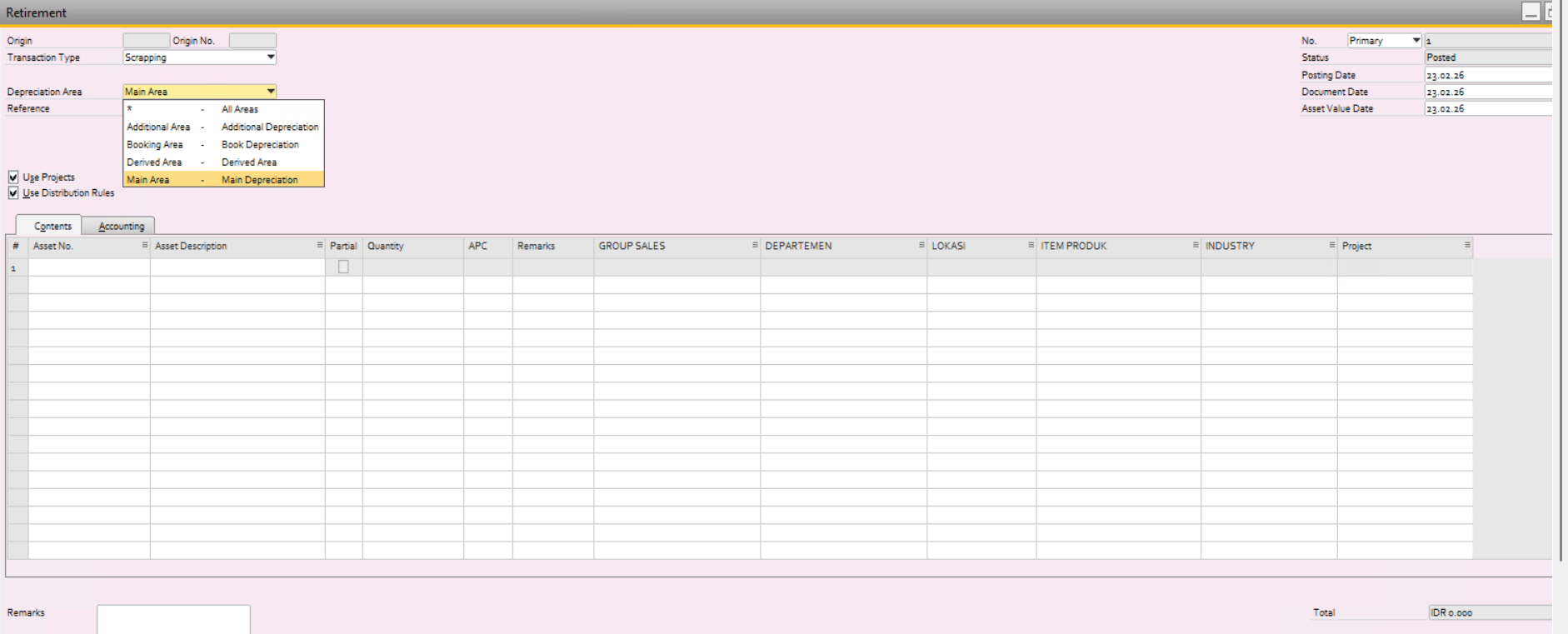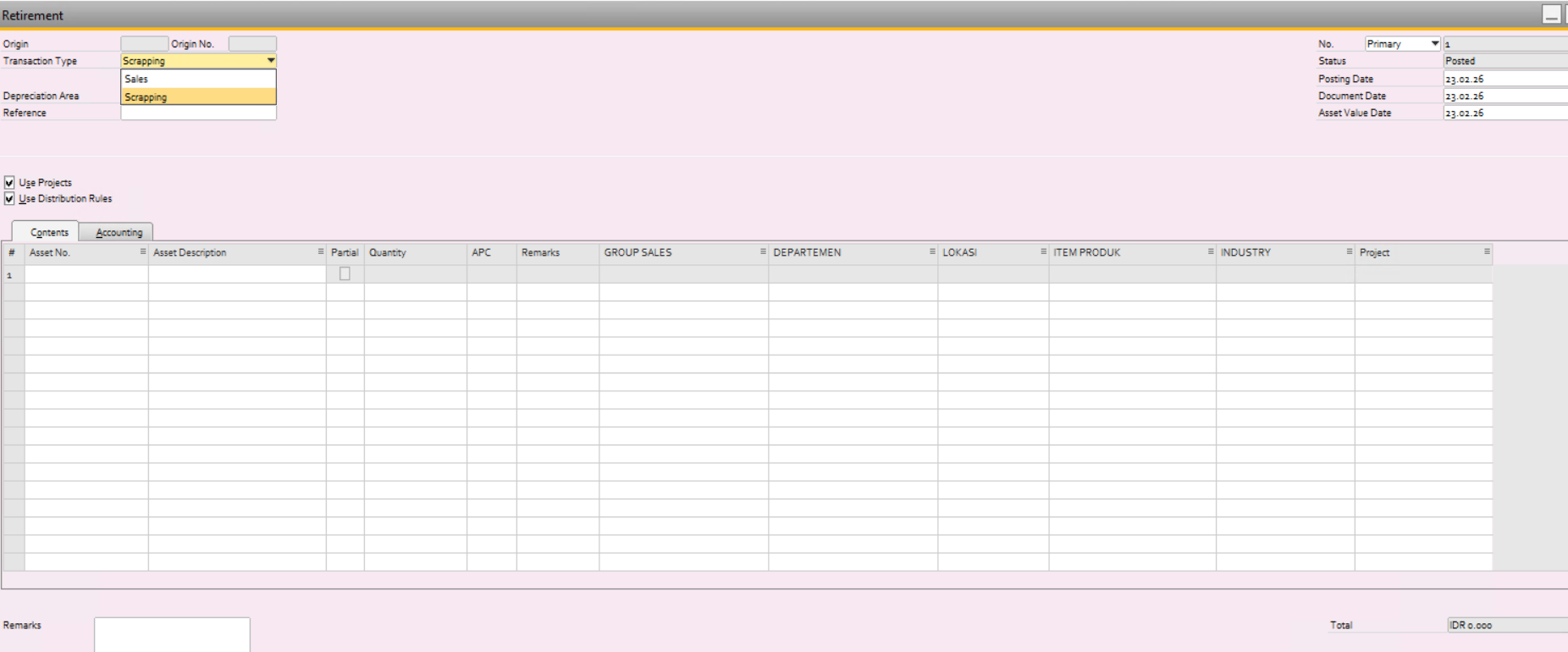 Di SAP Business One, Asset Retirement dapat dilakukan dengan 2 metode: