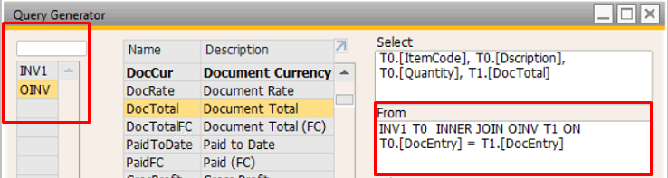 Setiap field yang dipilih dari panel tengah akan otomatis ditambahkan ke dalam bagian SELECT, sedangkan tabel yang dipilih akan dimasukkan ke dalam bagian FROM.