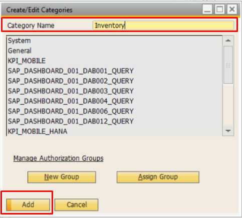 - Setelah nama kategori diisi dengan benar, tekan tombol Add untuk menambahkan kategori ke dalam sistem SAP Business One.
