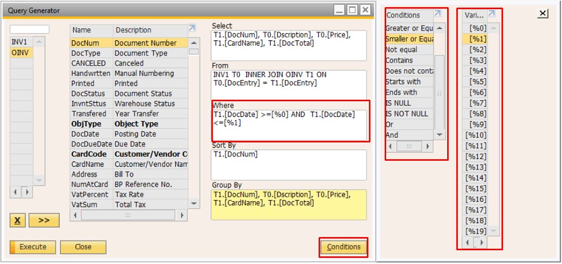 Smaller than | Menampilkan data dengan nilai lebih kecil | Digunakan untuk nilai di bawah batas tertentu | DocTotal < 1000000 |